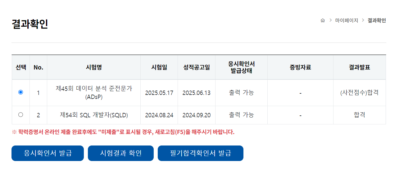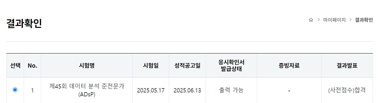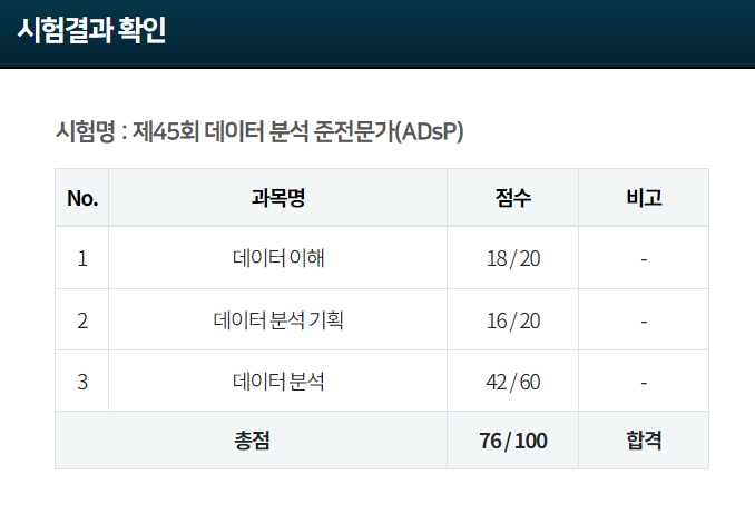 2025년 6월 6일 16시 ADsP(데이터분석 준전문가) 시험의 사전점수 결과가 발표되어 총점 76점으로 합격 기준을 충족했습니다.