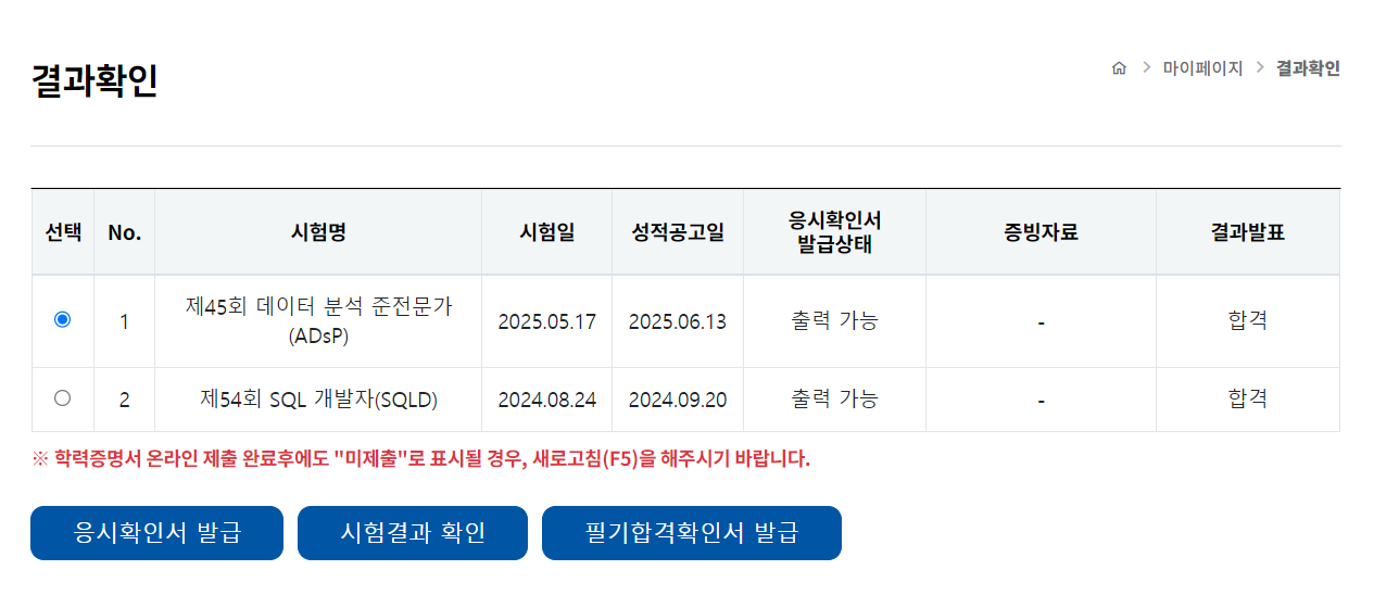 예정된 일정에 맞춰 한국데이터산업진흥원(Kdata) 홈페이지를 통해 합격 여부를 확인할 수 있었습니다. 사전 점수 기준으로 무난히 합격을 예측했기 때문에 결과에 큰 이변은 없었습니다.