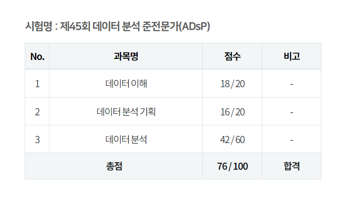 2025년 6월 6일 16시 ADsP(데이터분석 준전문가) 시험의 사전점수 결과가 발표되어 총점 76점으로 합격 기준을 충족했습니다.세 과목 중 상대적으로 난이도가 높은 ‘데이터 분석’ 영역에서 42점을